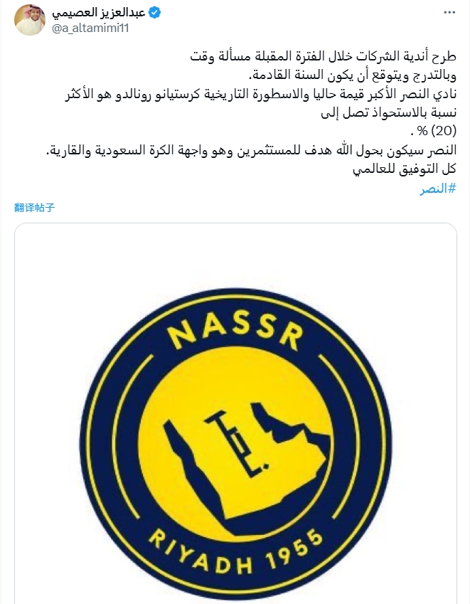 利雅得勝利目前是最有價(jià)值的俱樂部,羅納爾多目前的股權(quán)比率最高,達(dá)到20。利雅得勝利將成為投資者的焦點(diǎn),并成為沙特和亞洲足球的外墻。